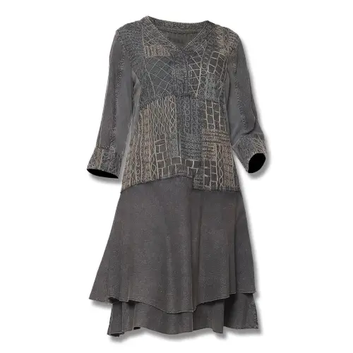 This classy Charcoal Dress is both elegant and comfortable, featuring subtle dynamic stitching and a flowy layered hem. (70% Rayon, 30% Cotton)
