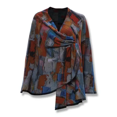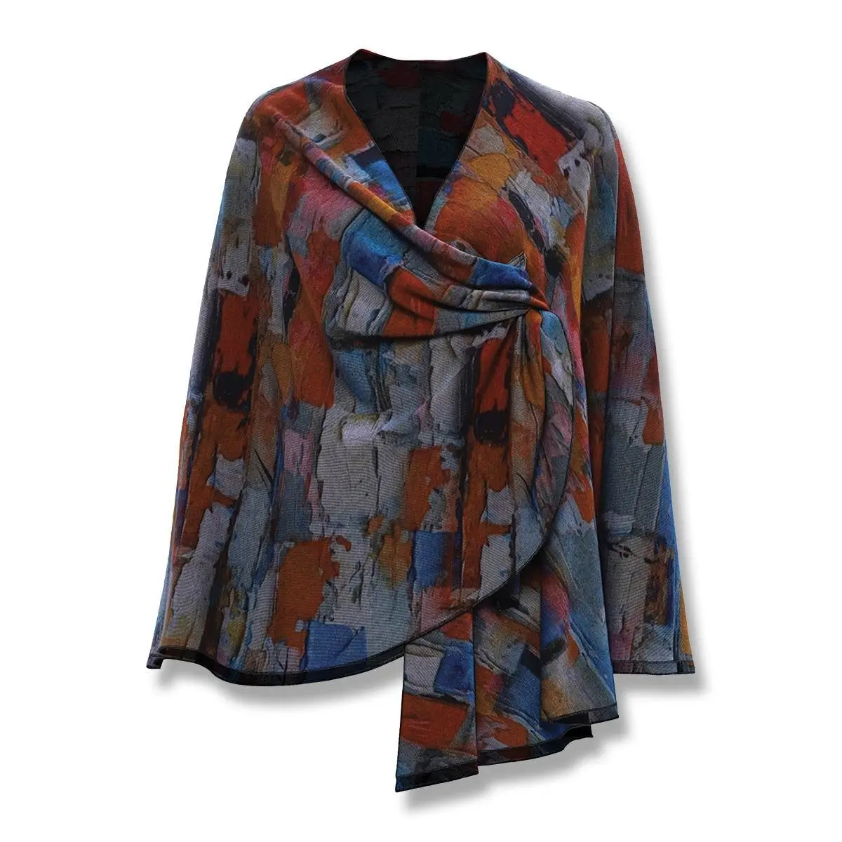 Whether worn with the colorful print to the outside or the classic solid black of the reverse side, this versatile wrap can be draped over almost any combination. Cozy and comfortable for those chilly nights! (60% Cotton, 40% Rayon)