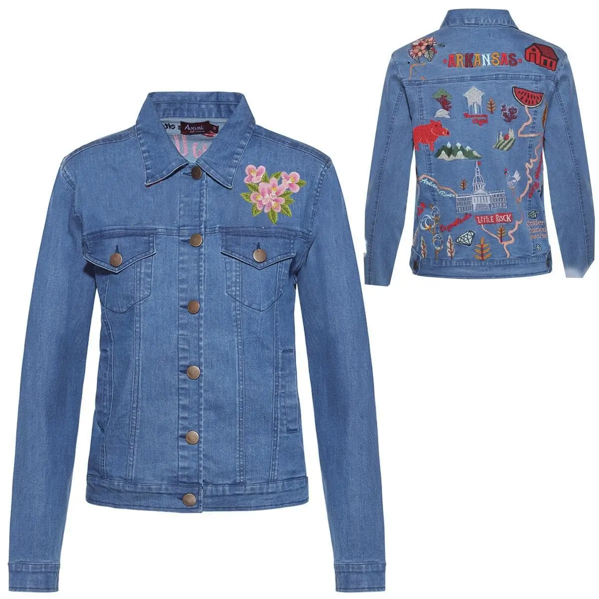 Fabulous stitched Arkansas-themed denim button jacket.