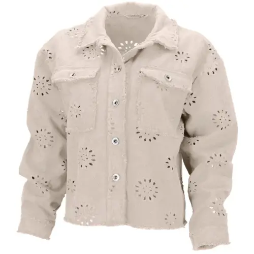 Soft and lightweight Peruvian cotton button-downs feature distressed edging, silver buttons, and amazing lace-like embroidery in a florette design. These supercool jackets are available in turquoise or soft tan. Simply stunning!
