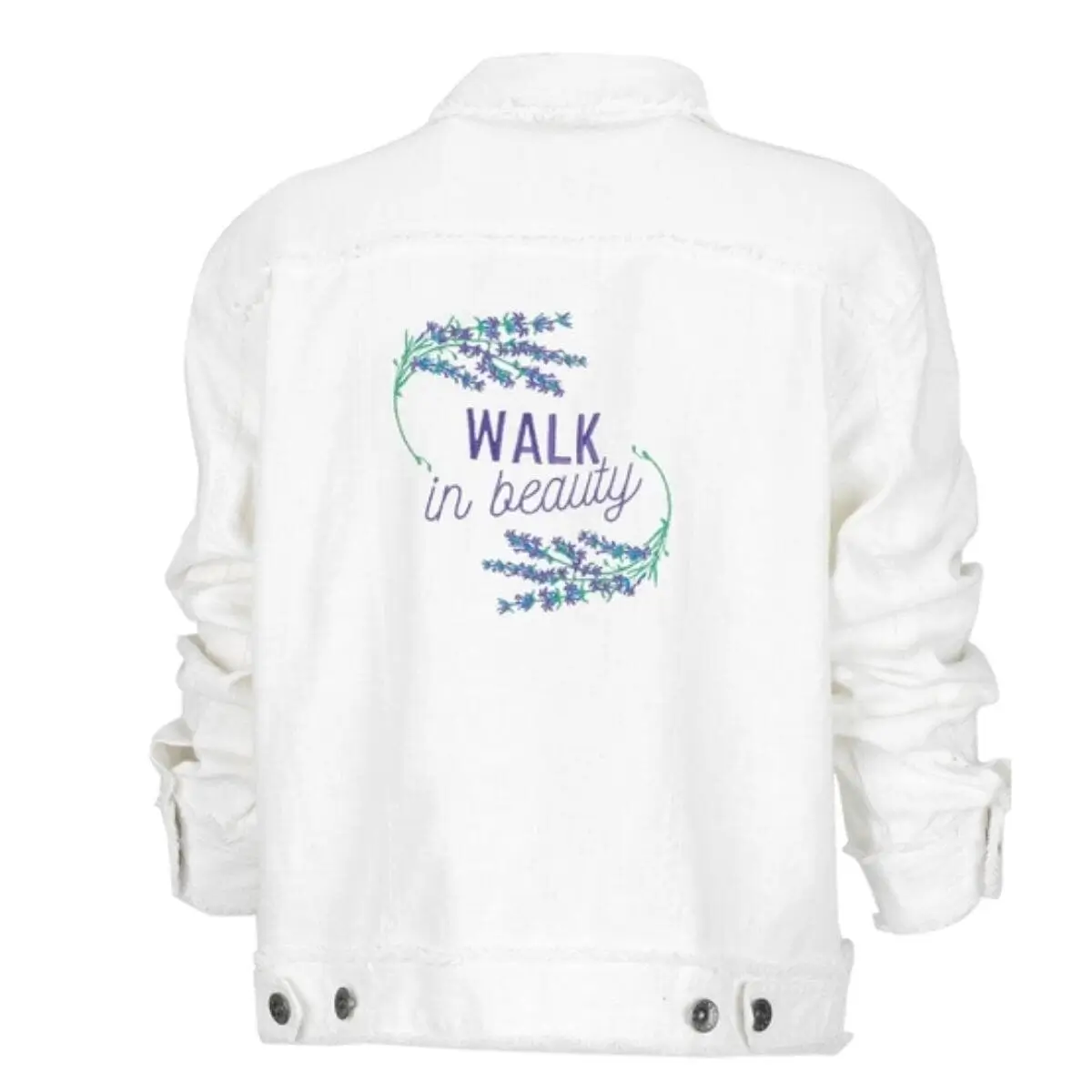 Wev'e updated the classic jean jacket by outfitting it in soft, washed linen. Delicately emblazoned on back with our embroidered :Walk in Beauty" lavender logo. Light fringe on the edges with buttons, this addition to your wardrobe will only get better with wear and will easily pair with just about everything.100% Linen.
