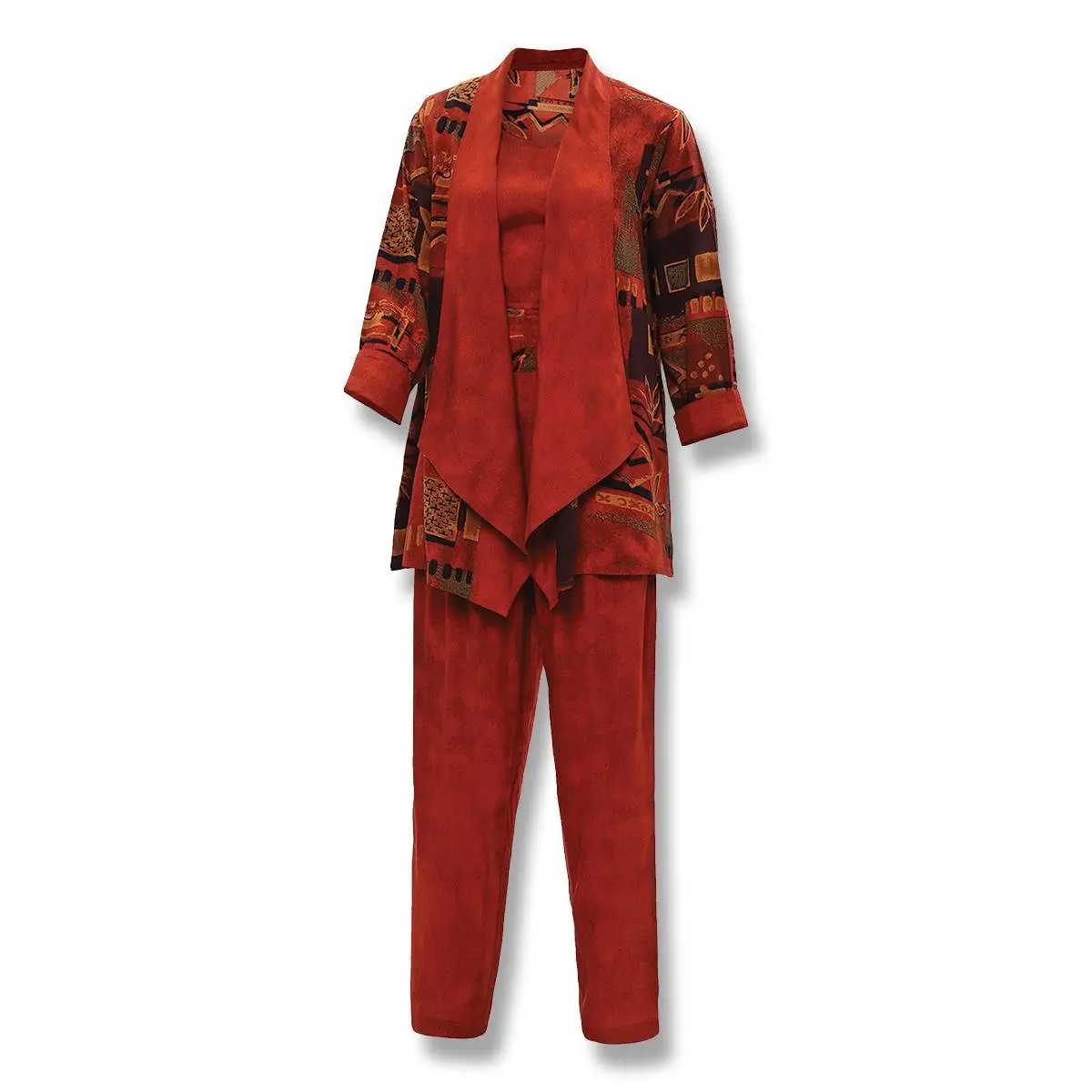 Exotic pattern, beautiful color. Drapery jacket has a refined fit, lapel gracefully cascades all down the front. Solid scoop neck tee; tapered leg pant with trapunto (quilted) waist in front, elastic in back. Pattern placement may vary. Hand-washable crinkle rayon. S (6-8), M (10-12), L (12-14), XL (14-16), 1X (18-20), 2X (22-24), 3X (24-26)