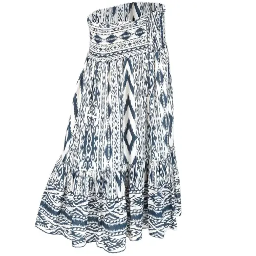 Show your boho chic side with this full-length skirt with a bold, vibrant abstract print design and elasticized waistband. The beautiful design pairs perfectly with any top. 100% Peruvian cotton.