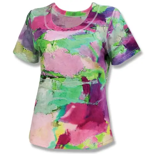 This gorgeous double-stitched scoop Adair Top features a bouquet of vibrant colors! Back pleat creates a roomy fit. (55% Cotton/40% Rayon/5% Spandex)