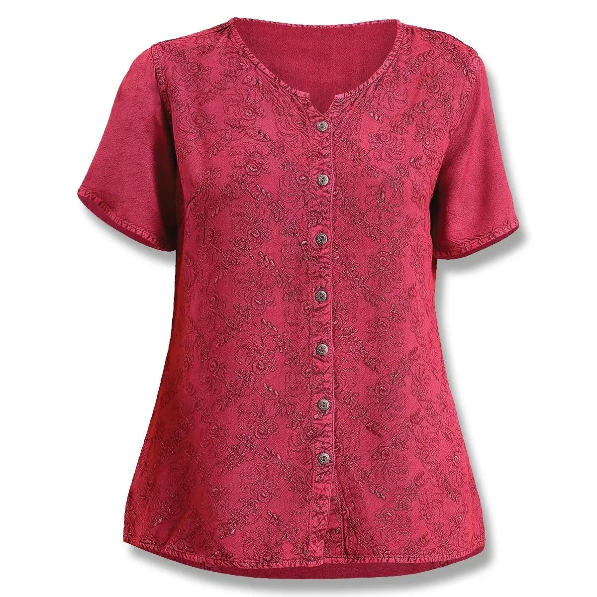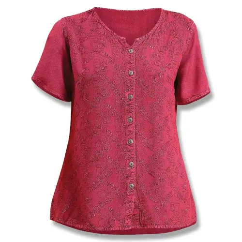 This cool, elegant top features a comfortable fit and a button down front, accented with subtle but ornate embroidery. (100% Rayon)
