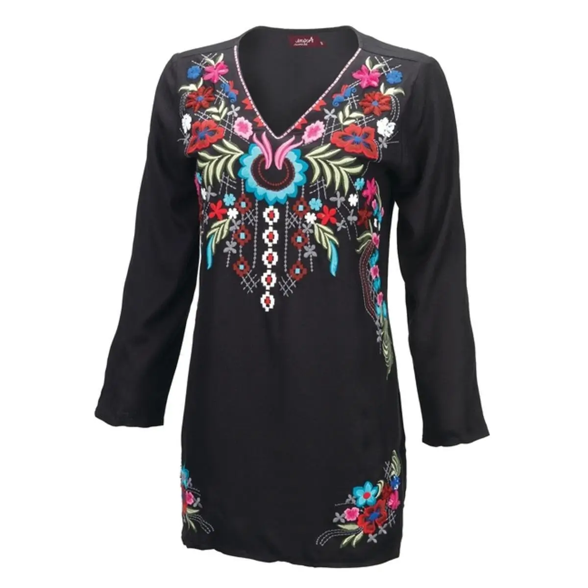 Dreams of the Native Southwest inspire these tunics with delicate but vibrant floral embroidery with a comfortable, relaxed fit. Pullover features long sleeves and a stylish but casual look. Wear with your favorite pair of jeans or skirt! (100% Viscose)