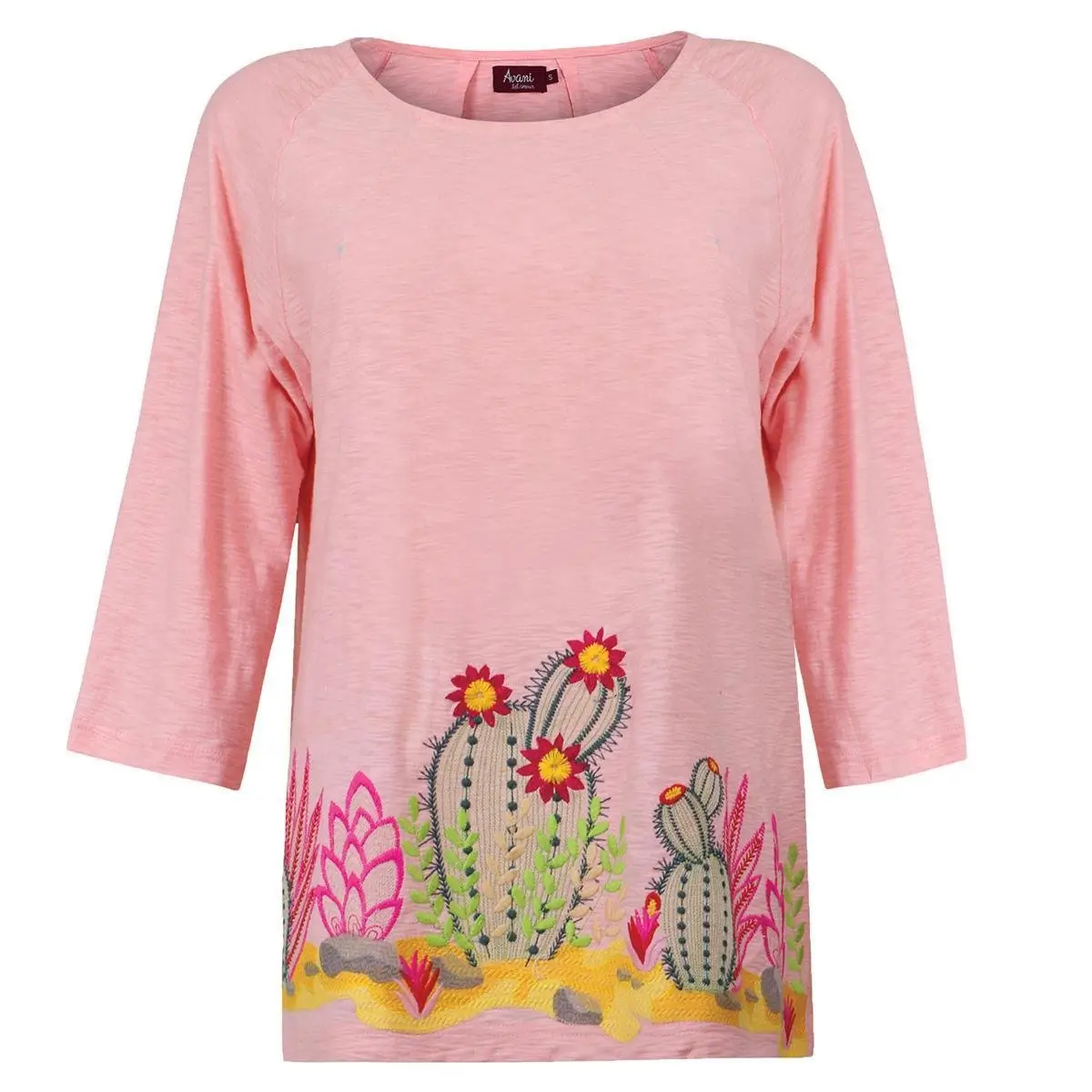 Our Cactus Rose Tunic is crafted with colorful intricate cactus and Southwest-inspired embroidery and features 3/4 sleeves and wide neck for easy movement. Style this tunic with jeans or leggings and your favorite pieces from our Pink Conch Collection. 100% soft and breathable cotton gauze.