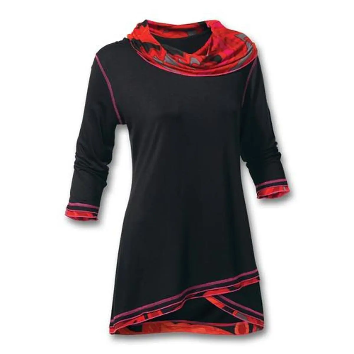 Crimson and Black are the dynamic duo of this Rayon Lira Knit, topped by an elegant cowl neck. Double-edged crossover hem and 3/4 sleeve ends, accented with contrast stitching. Wonderfully versatile dress it up with slacks or dress it down with leggings or jeans.