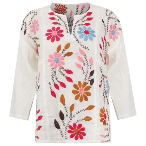 This super soft and lightweight 100% cotton tunic features a flattering split neckline and extraordinary embroidered flower and leaf design. An easy fit...pair with jeans for a look that can transition from daytime to date night.