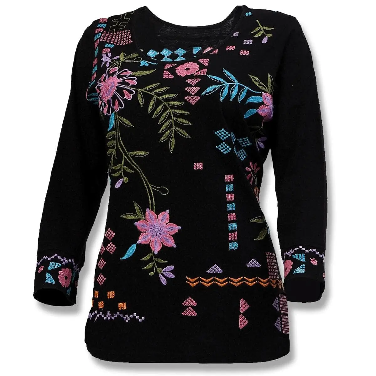 This stunning black Ginny Tunic is 100% Cotton, featuring unique artisanal embroidery, with special accents at the cuffs and a splash of embroidery on the back!
