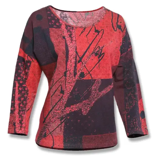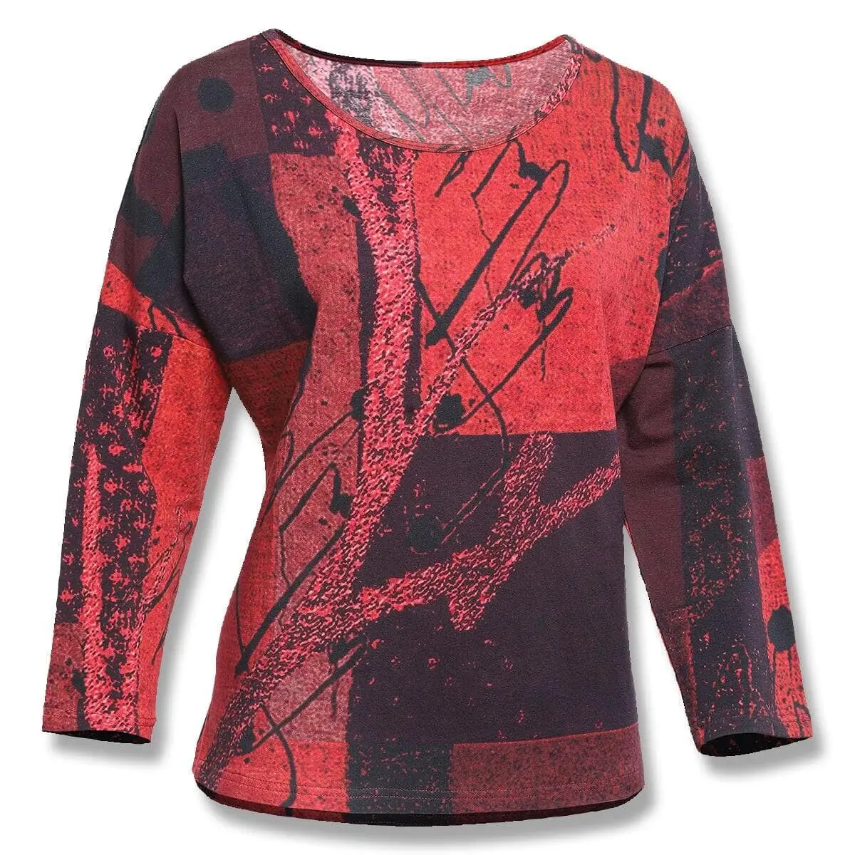 Dramatic reds and blacks adorn this eye-catching Luann Top! (55% Cotton, 40% Rayon, 5% Spandex)