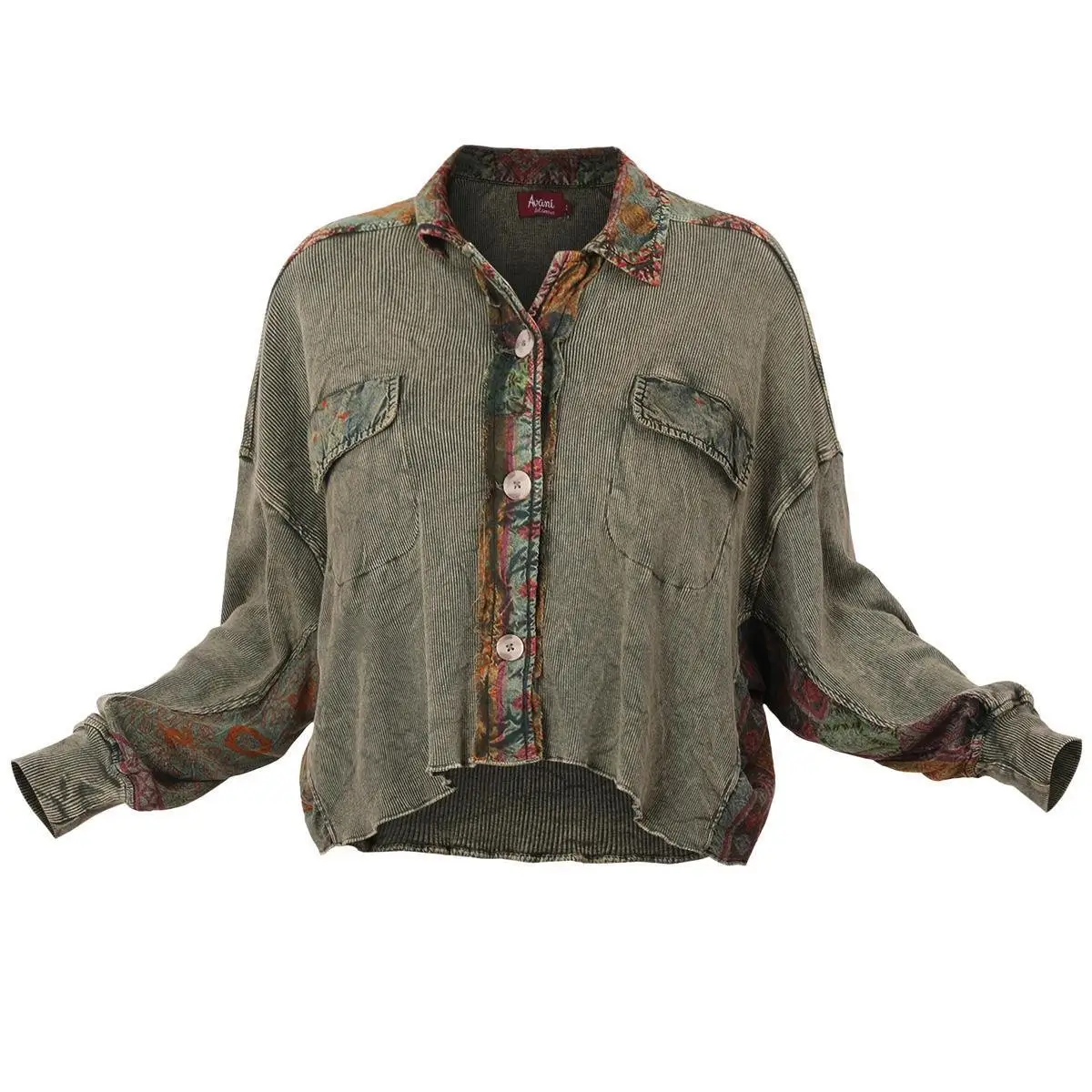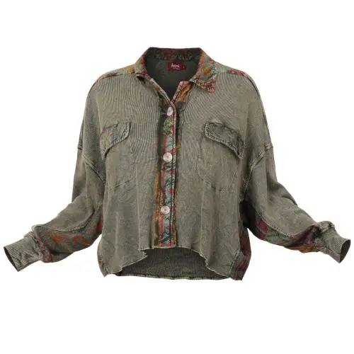 You will never be out of style with these soft and breezy cotton ribbed knit button-downs, with four colors to choose from. Complimentary paisley trim throughout, loose sleeves, two front pockets, and a