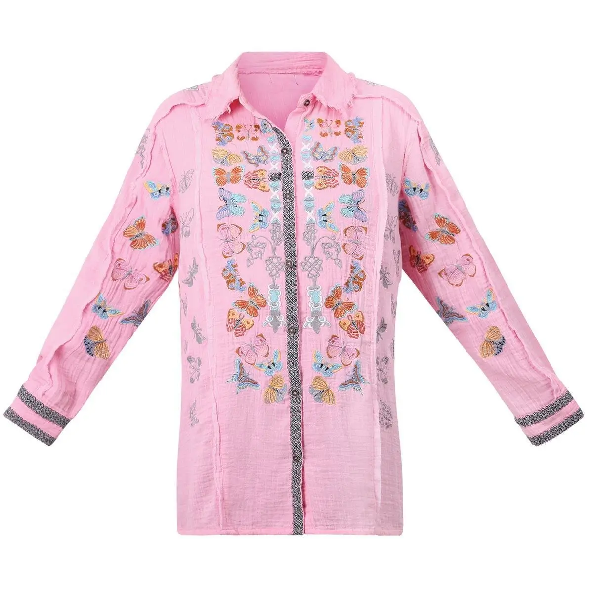Super soft and lightweight button-down long-sleeve shirt/tunic features a plethora of colorful embroidered butterflies, distressed collar, and embroidered cuffs. A nice n' easy design for Spring… pair