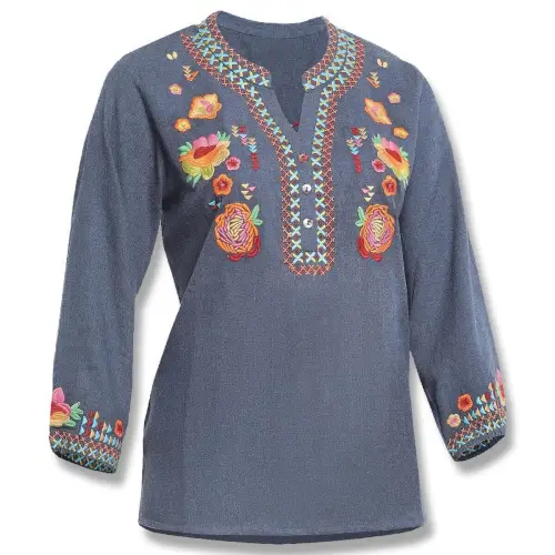 This stunning Victoria Top is a true work of art, featuring a modified V-Neck adorned with sumptuous embroidery that is further accented at the cuffs! (60% Cotton/40% Rayon)