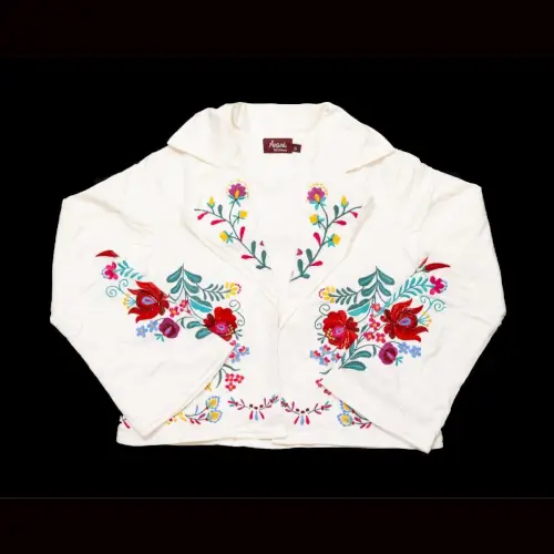 This is not just an ordinary blazer/jacket! Vibrant floral embroidery contrasts nicely with white jacket. Short jacket features open front and flared sleeves with a comfortable, relaxed fit. Dress it up or wear it with your favorite pair of jeans...so comfortable you could wear it anywhere!