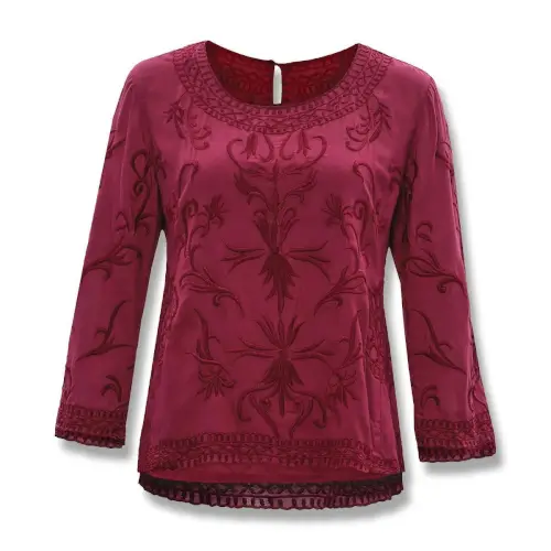 This exquisite Sylvia Top features a rich, wine colored garment adorned with intricate embroidery covering the complete front and back of the top— including the sleeves. (100% Cotton, Modal Lining)