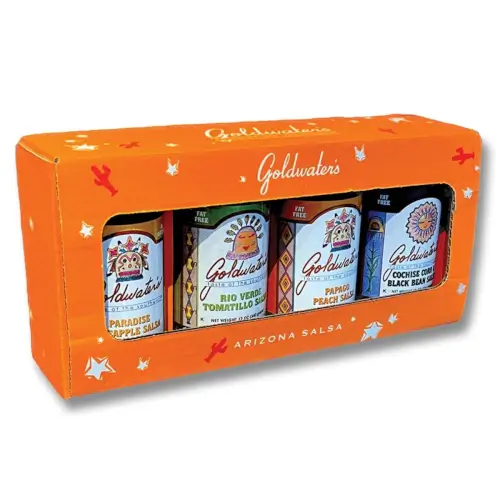 Made exclusively for Southwest Indian Foundation by Goldwater's, this colorful Southwest Pueblo Pak includes Pineapple, Peach, Tomatillo and Corn & Bean Salsas. Delicious as dips or as an enhancement to your meats, eggs and nachos. Only all natural ingredients are used - no preservatives. Makes the perfect gift! (Four 12 oz. Bottles)
