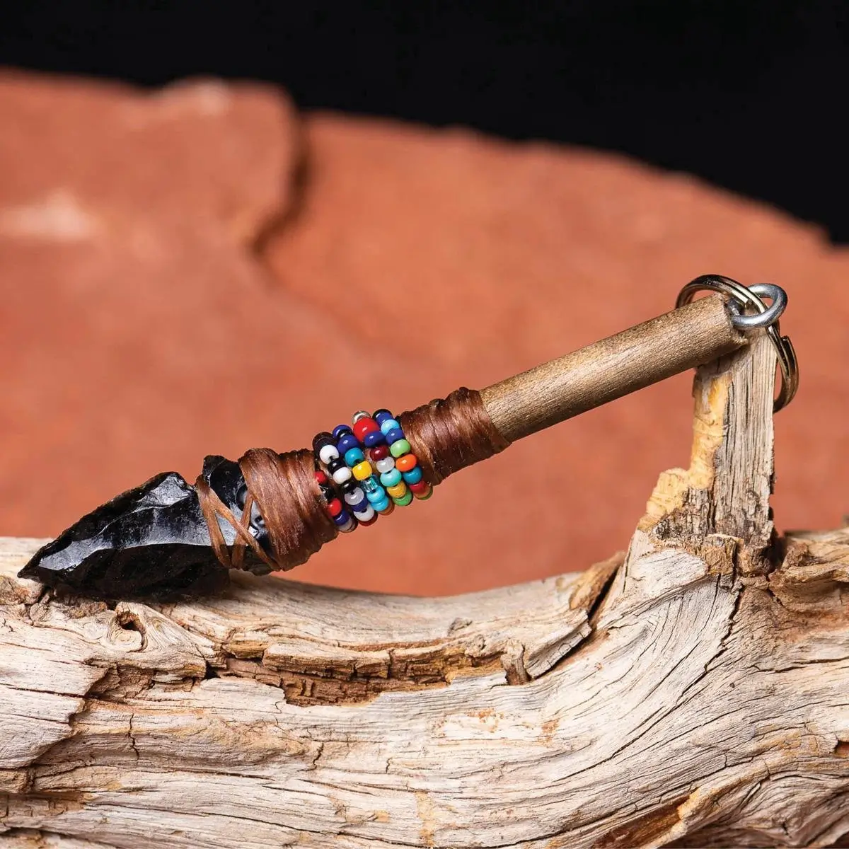 Hand-made, features colorful beading and carved stone arrowhead. Approx. 3"