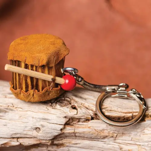 Entirely handmade. Leather is stretched and hand-laced into place to make a drum. Features a red mallet. Approx. 4"