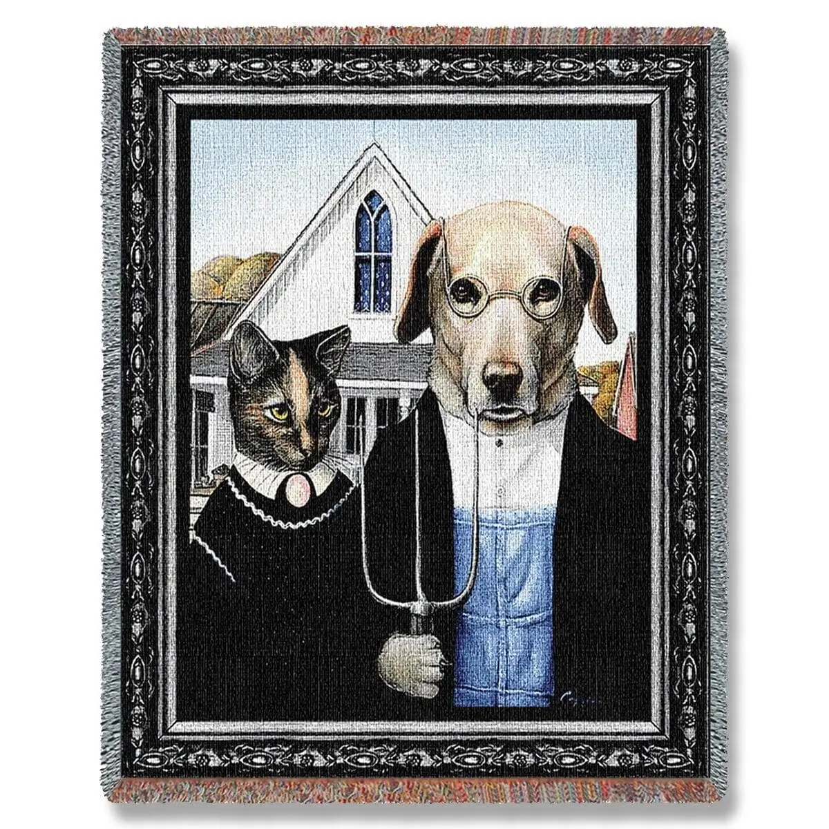 This “Animal Gothic” Blanket is a playful takeoff on the famous Grant Wood painting! Made of 100% Cotton, and proudly woven in America using advanced Jacquard weaving techniques. (54” x 72”)