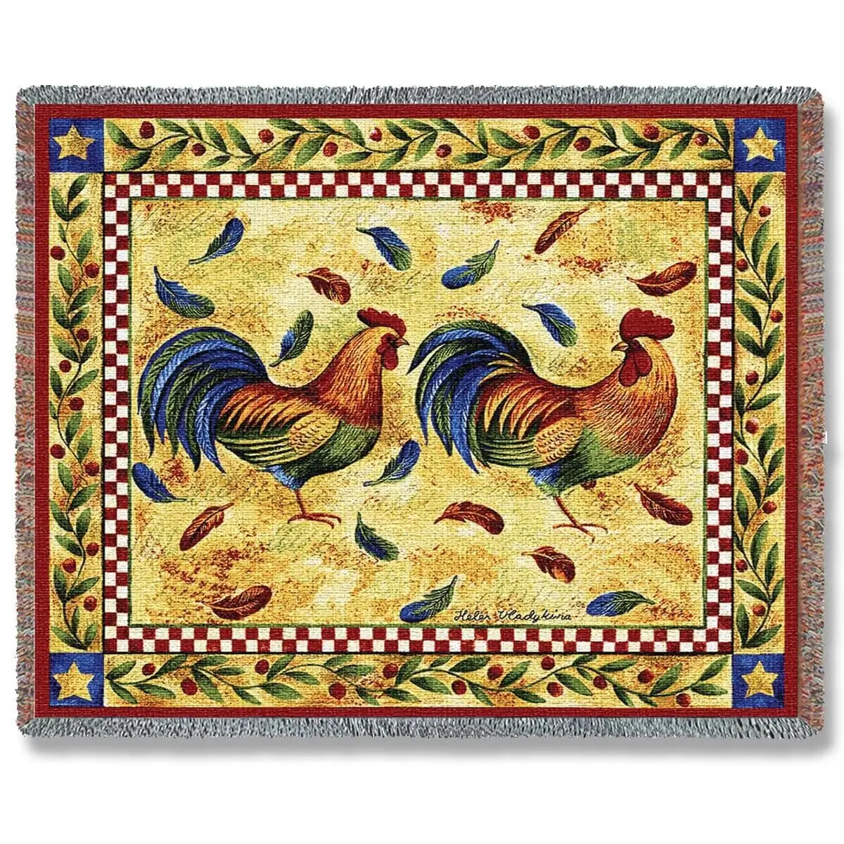 This colorful Two Roosters Blanket is made of 100% cotton, ensuring vibrant colors and a rich feel. Proudly woven in American using advanced Jacquard weaving techniques, producing a depth and texture not found in traditional home decor. (54" X 72")