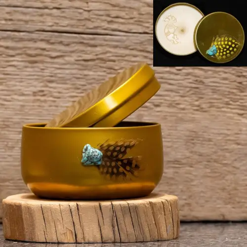These charming hand poured scented candles come in elegant tin containers, complete with decorative lids adorned with turquoise and feathers and a Kokopelli imprint in the wax. (Candles: 3" Diameter)