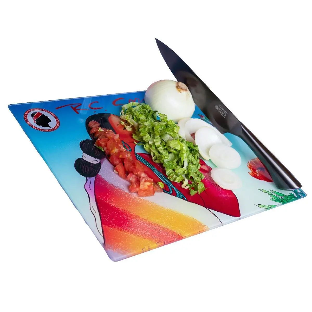 R.C. Gorman is one of the most revered and celebrated Native American artists in history. We are thrilled to be able to offer to you this "Special Edition" Floria Charcuterie/Cutting Board. Our cutting boards are made of strong tempered glass that is heat and shatter-resistant. Hygienic and non-porous surface resists stains and scratches. Hand wash only. 15 3/4" X 11 3/4"