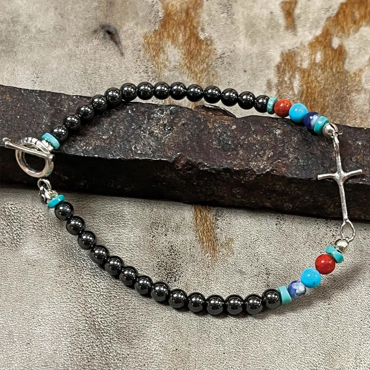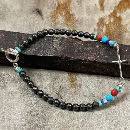 Each of these stylish hand-made bracelets features a silver cross charm, turquoise and various color beads. There are three styles to choose from, this is our Turquoise and Polished Beads selection. Toggle clasp enclosure.