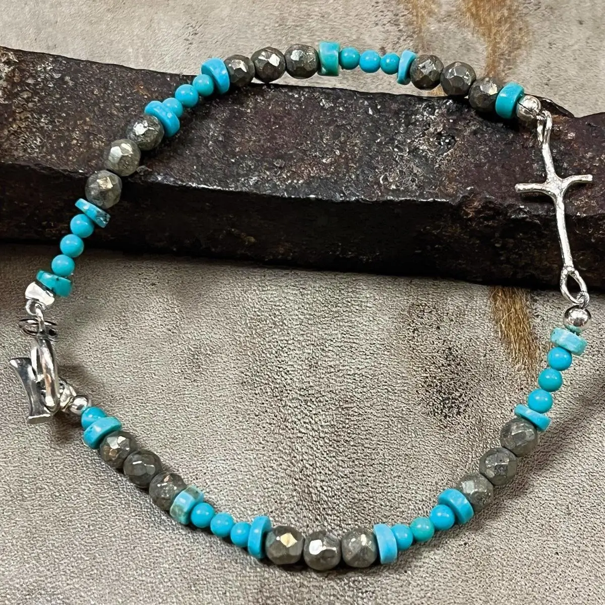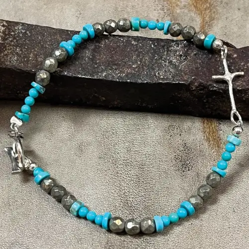 Each of these stylish hand-made bracelets features a silver cross charm, turquoise and various color beads. There are three styles to choose from, this is our Turquoise and Pyrite Beads selection. Toggle clasp enclosure.