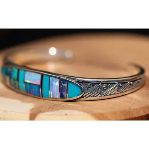 This unique inlay combination of Turquoise and Spider Opal has incredible sizzle and pop. These are pieces--which are inlaid in sterling silver--you can enjoy everyday and for generations, a kaleidoscope of colors in endless combinations. Native American made in New Mexico.