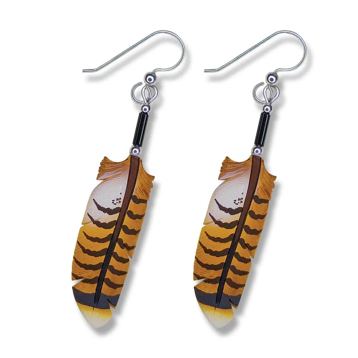 Artisan Lonnie Cloud is the creator of these amazing, hand-carved and hand-painted Red Tail Hawk Feather Earrings. Made in the USA! Pierced only. 1 5/8" long.