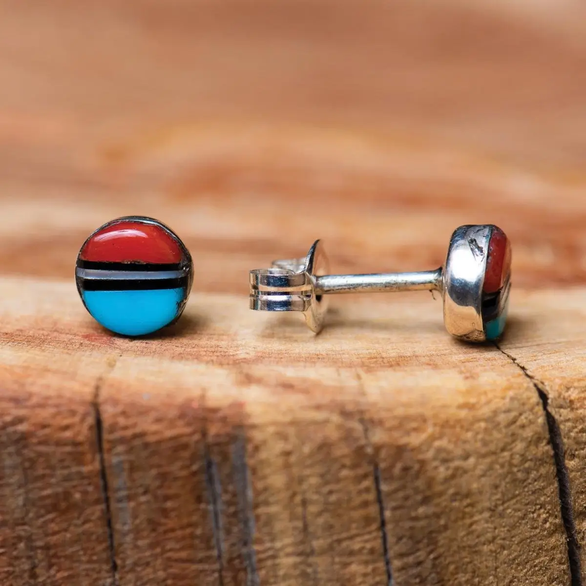 These Inlay Stud Earrings are an exquisite inlay of turquoise and coral, and sterling silver and 1/4" in size.