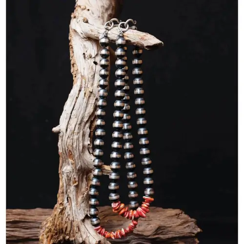 Sterling silver 10mm Navajo pearls and natural coral necklace. These fabulous hand-finished pieces will be a valuable addition to your collection of fine Native American jewelry. 16" & 18" Necklaces