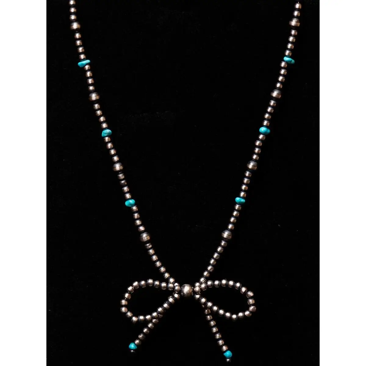 Adds playful tough to any outfit with this unique necklace with whimsical bow design. Exquisite necklace features sterling silver Native American Navajo pearls, natural turquoise, and a whimsical bow pendant. A unique piece of jewelry that is sure to catch the eye! 18"