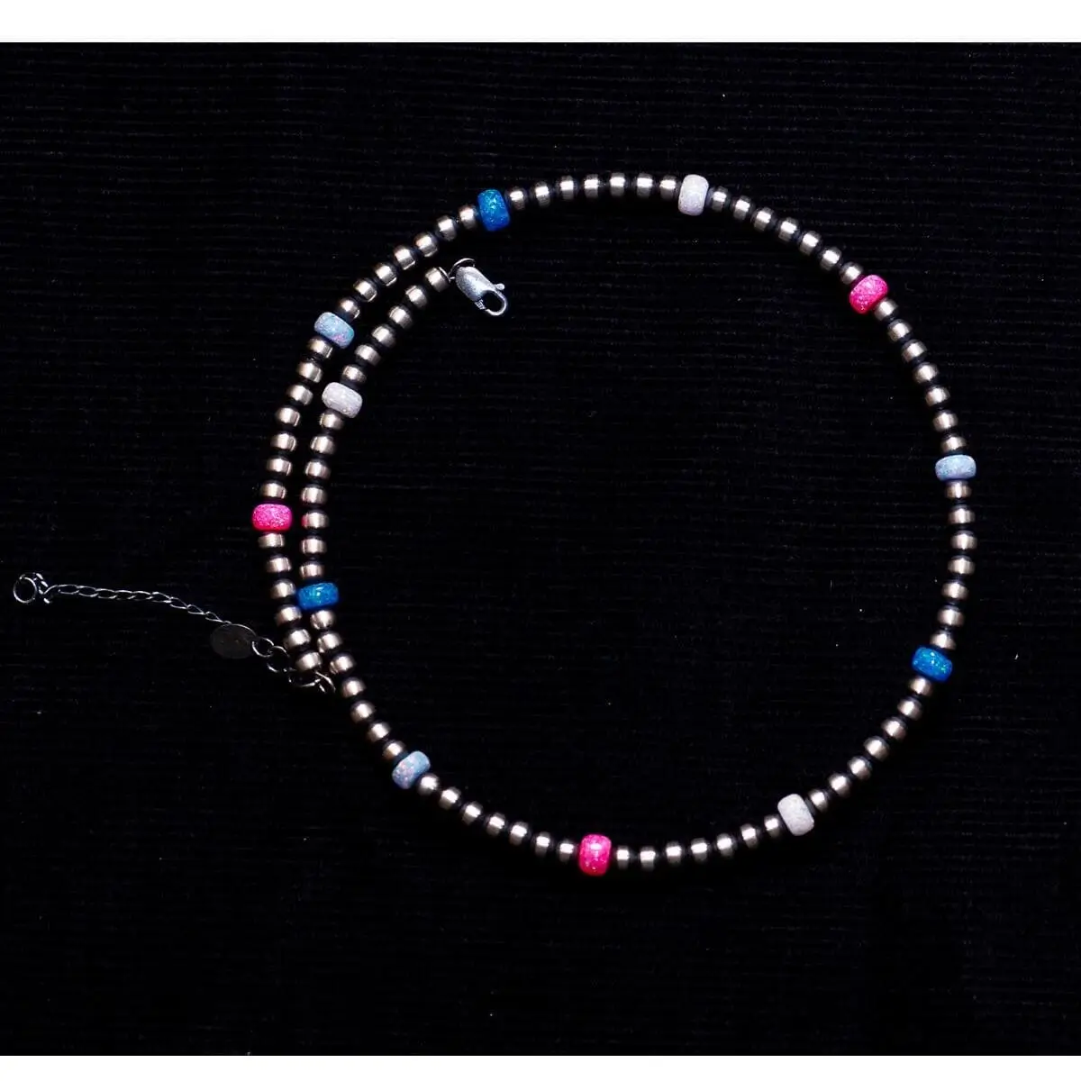 Brighten up your look with these gorgeous sterling silver Navajo pearls that feature pops of bright color of synthetic opal stones in speckled pink, blue, white, and light blue. Partners perfectly with our dangle teardrop-shaped earrings.