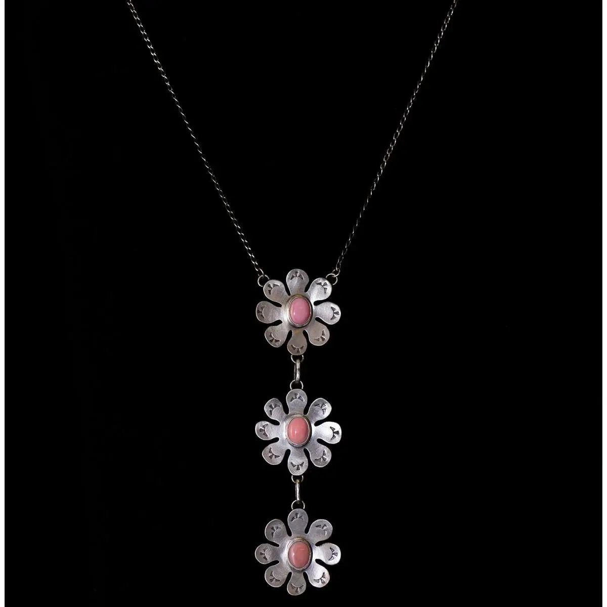 Vibrant necklace features three flowers each with hand hammered sterling silver petals and pink conch ovals.