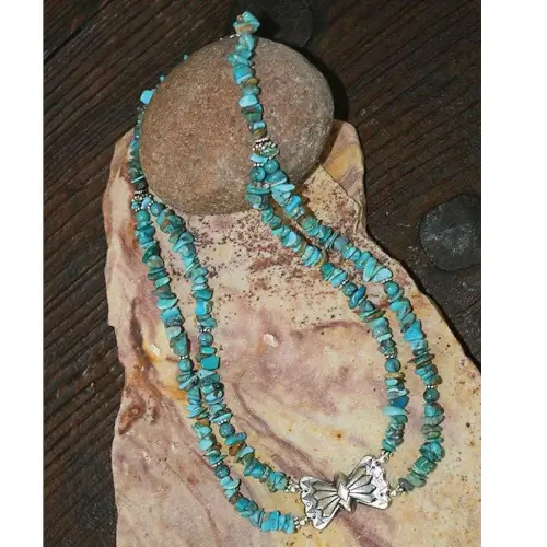 Express your inner goddess with this double strand necklace of turquoise stones, with hand-tooled sterling silver butterfly.