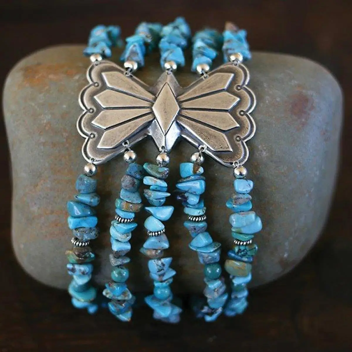 An exquisite multi-strand turquoise stone bracelet adds a wonderful pop of color to every look. This stunning bracelet features five strands of magnificent natural turquoise with a large hand-tooled sterling silver butterfly.