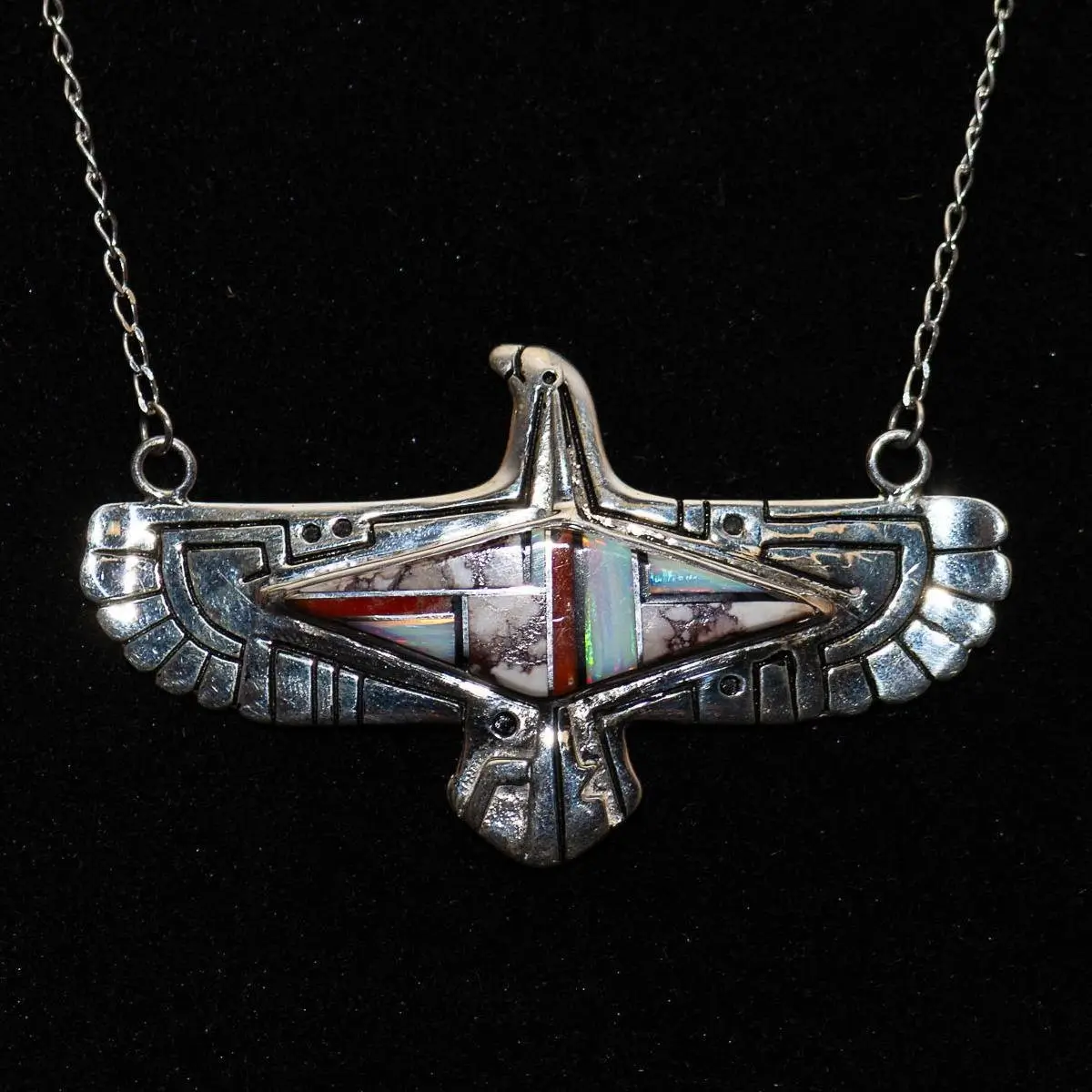 A wonderful piece of Native artistry, this gorgeous necklace features inlays in an intricately hand-stamped thunderbird design in the sterling silver.