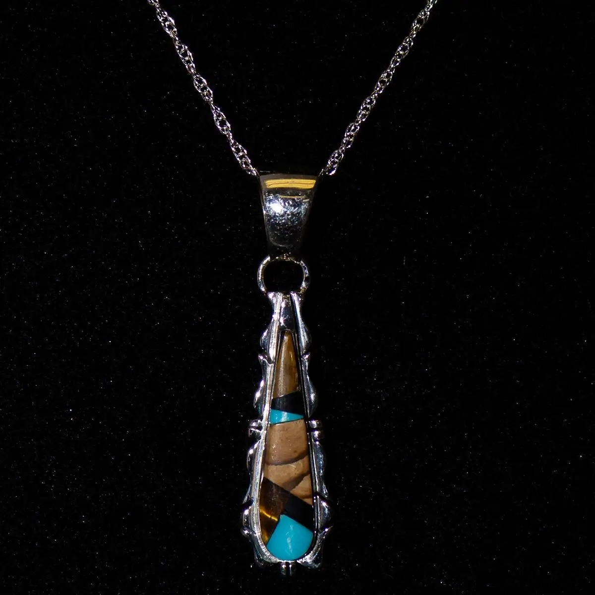 Beautiful pendant of tiger eye, picture jasper, turquoise and black jade inlaid in sterling silver. Complete with 16" sterling silver chain. (1 1/2" Long)
