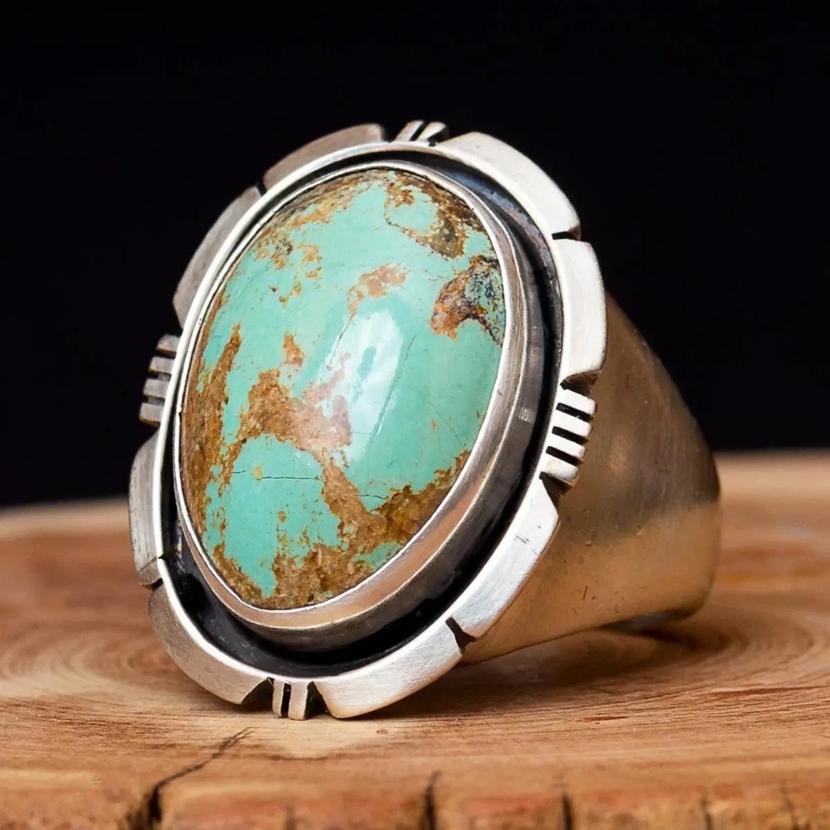 Classic impactful ring features oversized turquoise stone and polished silver with hand-tooled design.
