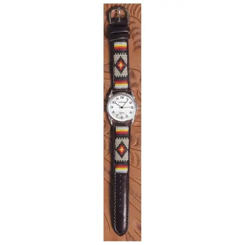 Intricate and colorful hand-beading on genuine leather straps sets off this handsome Navajo Beaded Mens Watch. (Quartz Movement)
