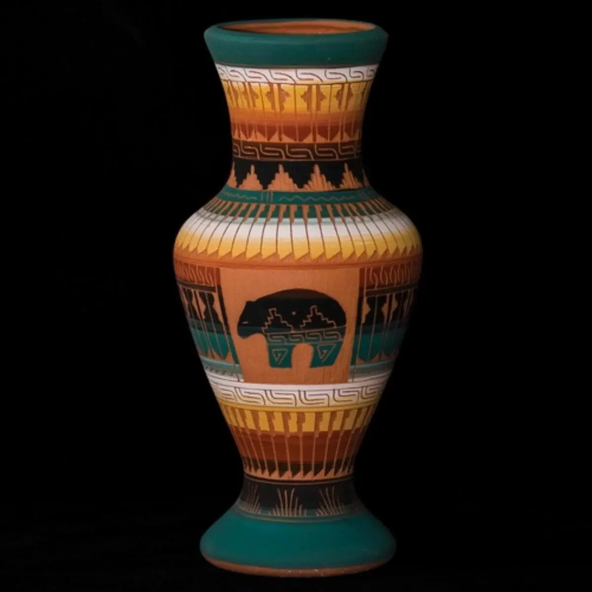 In Native American beliefs, the bear symbolizes physical strength, leadership, and is known as "first helper". Bright earthy coloring is featured on this Navajo-made terracotta pottery vase. Etched with a bear design on both sides. 12", for display only.