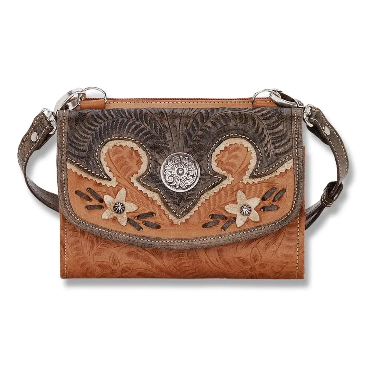 This gorgeous Desert Wildflower Crossbody Bag/Wallet features hand-tooled vegetable tanned 100% full grain leather with flower appliques and silver hardware. Crossbody has zipper closure and back zipper pocket. Flap opens to reveal a full wallet with 2 clear ID windows, 4 card slots, 2 open compartments, a zipper coin compartment and a pen holder. Adjustable/removable shoulder strap 24-27” drop Each Desert Wildflower Tote is crafted completely by hand, one at a time, by descendents of the Guarani Tribe in Paraguay. (Shoulder Straps: 12” Drop) (7.5” x 6” x 2.5”)