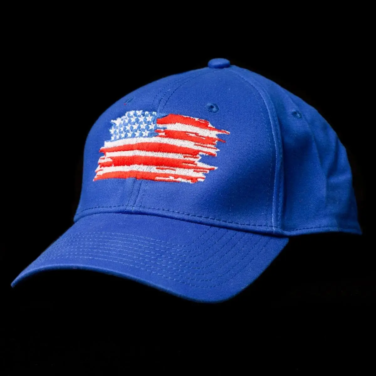Fitted, relaxed and curved blue cap with embroidered US Flag on front. Made from garment washed cotton twill.