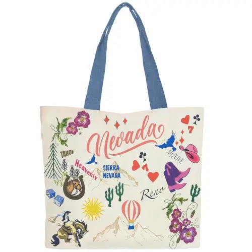 Colorful Nevada Tote Bag with contrasting handle and detailed embroidery. 19" x 14"