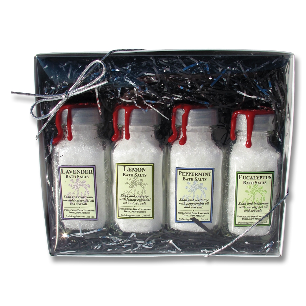 Our Bath Salt Apothecary Set from the lavender fields of New Mexico allows you to mix and match essential oil infused sea salt for a therapeutic soak.Choose from lavender, lemon, peppermint or eucalyptus and customize the curative and calming properties of these natural oils to your desire. Try a few tablespoons of a relaxing lavender and lemon blend, or maybe lemon and peppermint for a reinvigorating bath. Eucalyptus and peppermint are both wonderful for decongestion and both have anti-inflammatory benefits.